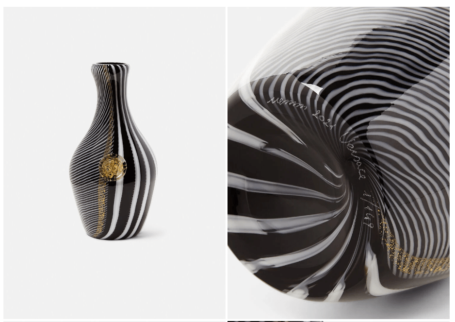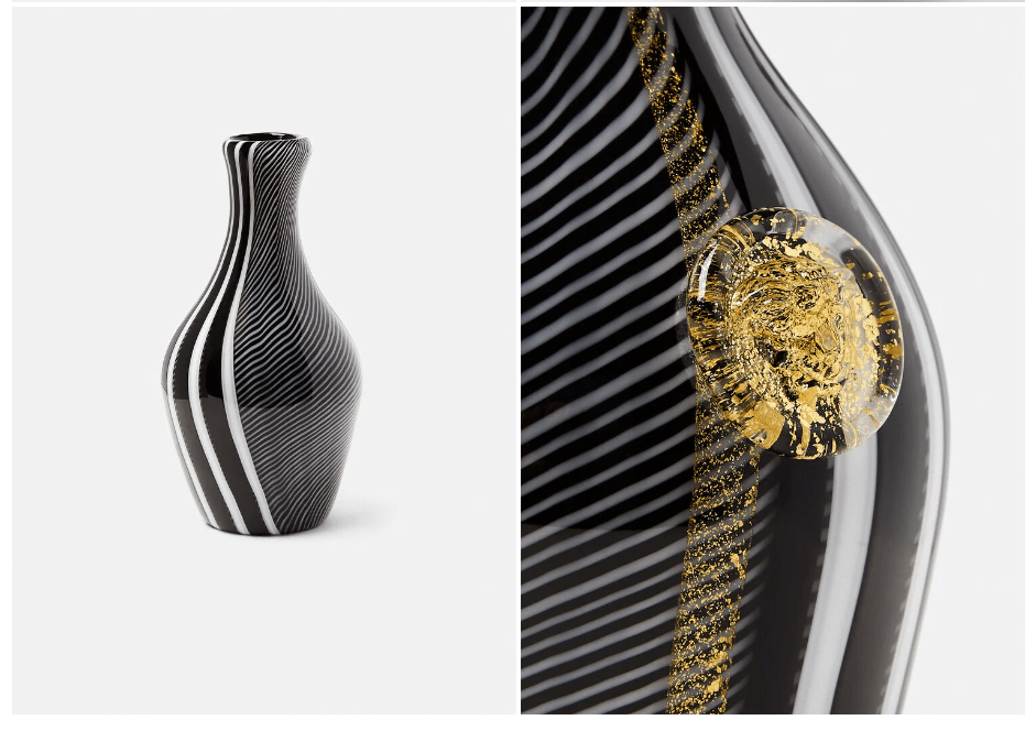Sublime vitality – this Smoking vase is blown using the handmade “Canne” technique: an incredibly complex process where round, pulled-glass rods are fused together and then blown. The vase stands out for its expressive aesthetic, found in its colour combinations and unique formation. Golden Medusa accents add a signature finishing touch to the piece.