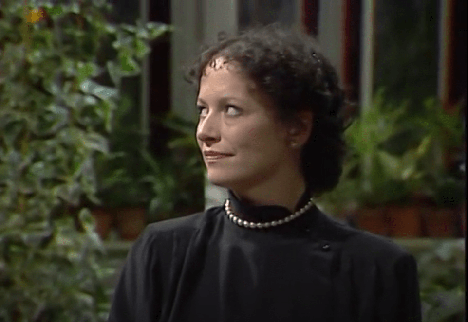 This look must of been an 80’s take on the 1920’s or 1930’s. It works quite well as she doesn’t look like she is at a fancy dress party. You would only know by studying film/tv fashion for a few years.