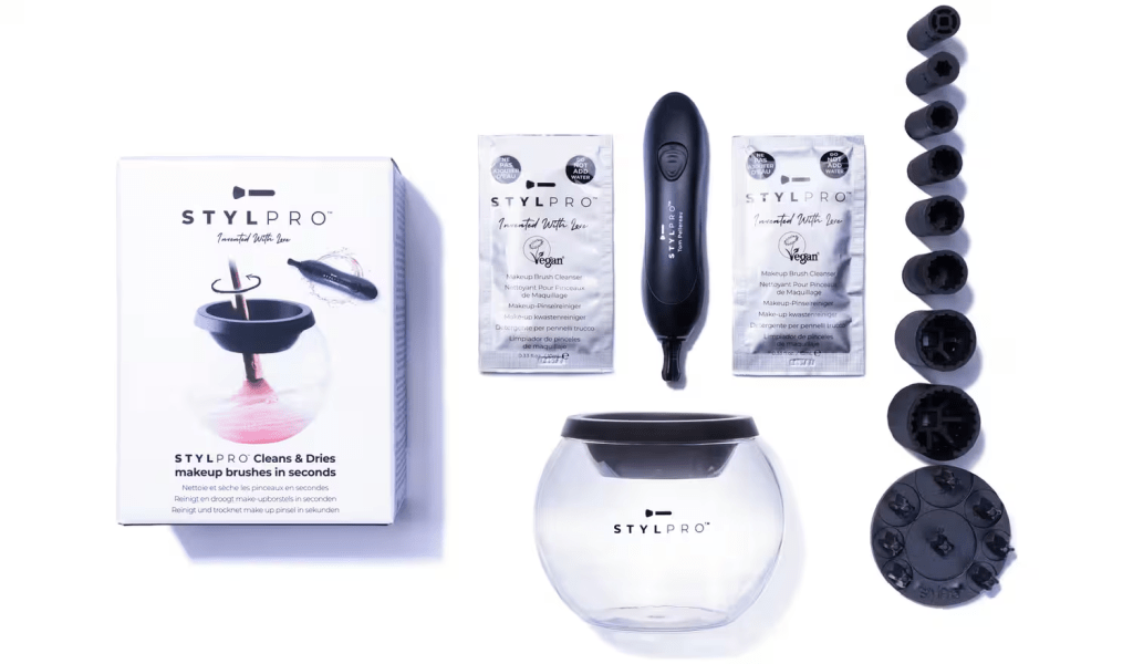 - Includes StylPro device, spindle, set of 8 collars, collar base, Tritan unbreakable bowl including splash neck, 2x 10ml sachets of StylPro make-up brush cleanser.