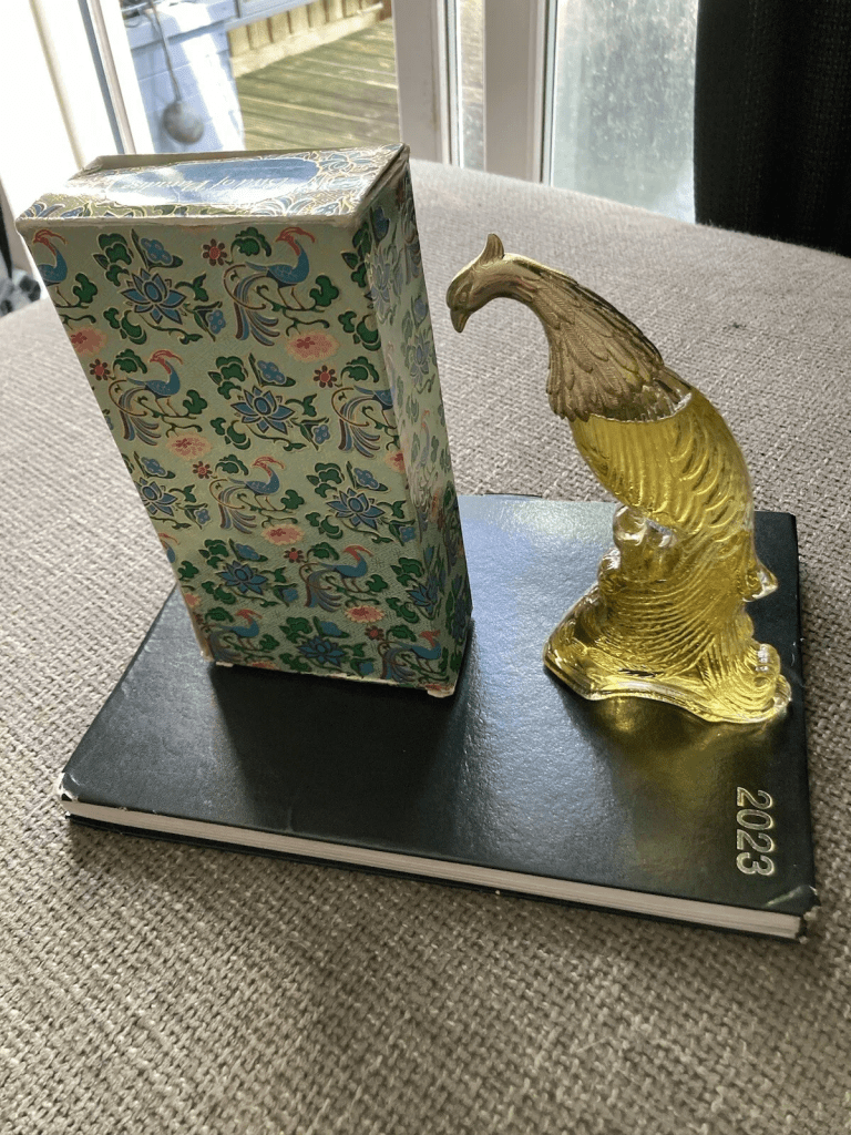 This still contains bath oil. Reminds me of Victorian weekend. Not sure about the figurine – like the box though.