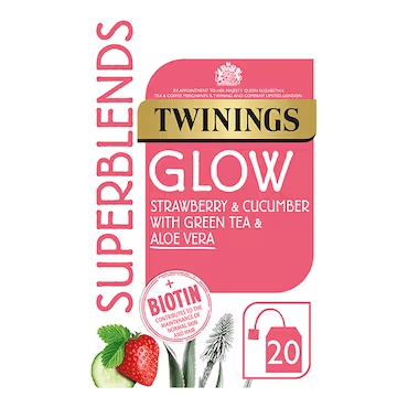 Superblends – Glow, A Strawberry and Cucumber Flavoured Herbal Infusion with Green Tea, Aloe Vera and added Biotin.