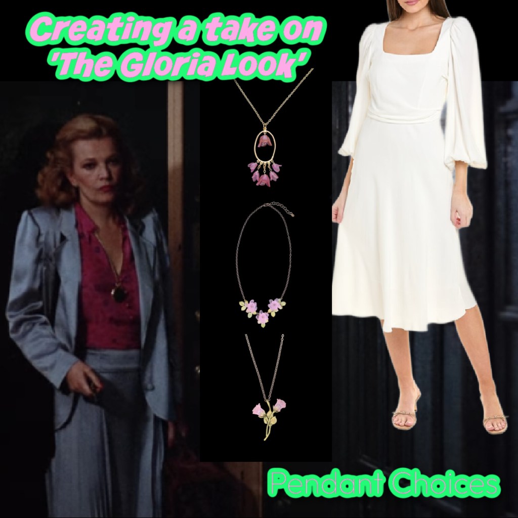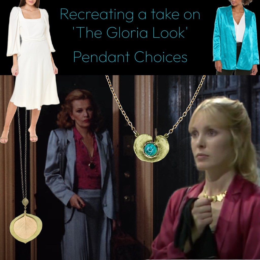 Gloria is wearing gold pendant jewellery, I think it is a watch, I’d style this more feminine myself, I think this film is about Gloria getting in touch with her feminine side so she might opt for Michael Michaud jewellery also now.
