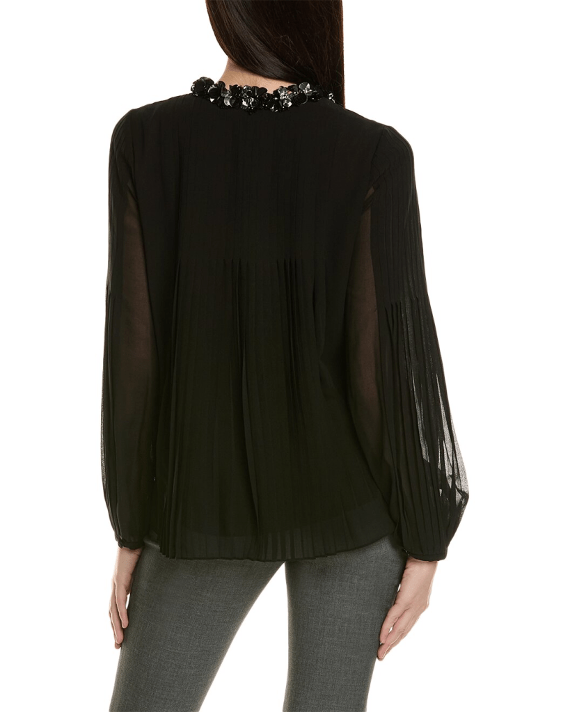 Design details: embellished neckline with self-tie detail, pleated detailing and button cuffs