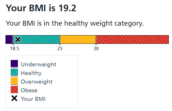 Your BMI is in the healthy weight category.Your body mass index result is shown on a chart here. A full description can be found in the text below it.