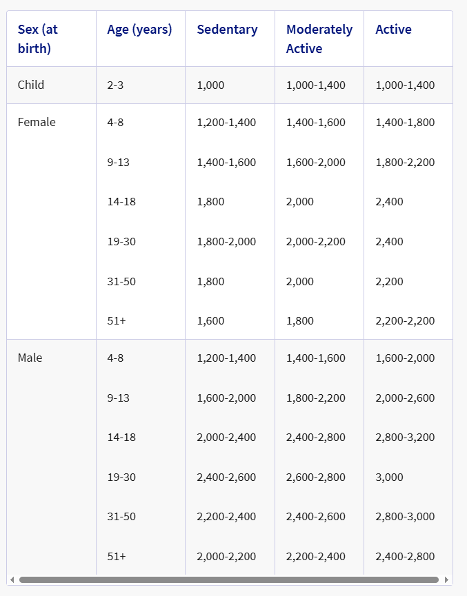 Older adults (60+): Men may need 2,000 to 2,600 calories, and women may need a similar range.