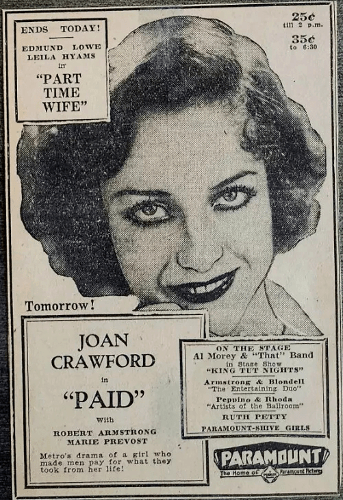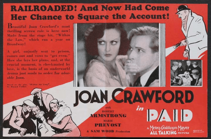 Paid is a 1930 American pre-Code drama film starring Joan Crawford, Robert Armstrong, and Kent Douglass in a story about a wrongly accused ex-convict who seeks revenge on those who sent her to prison using a scam called the “Heart Balm Racket”.