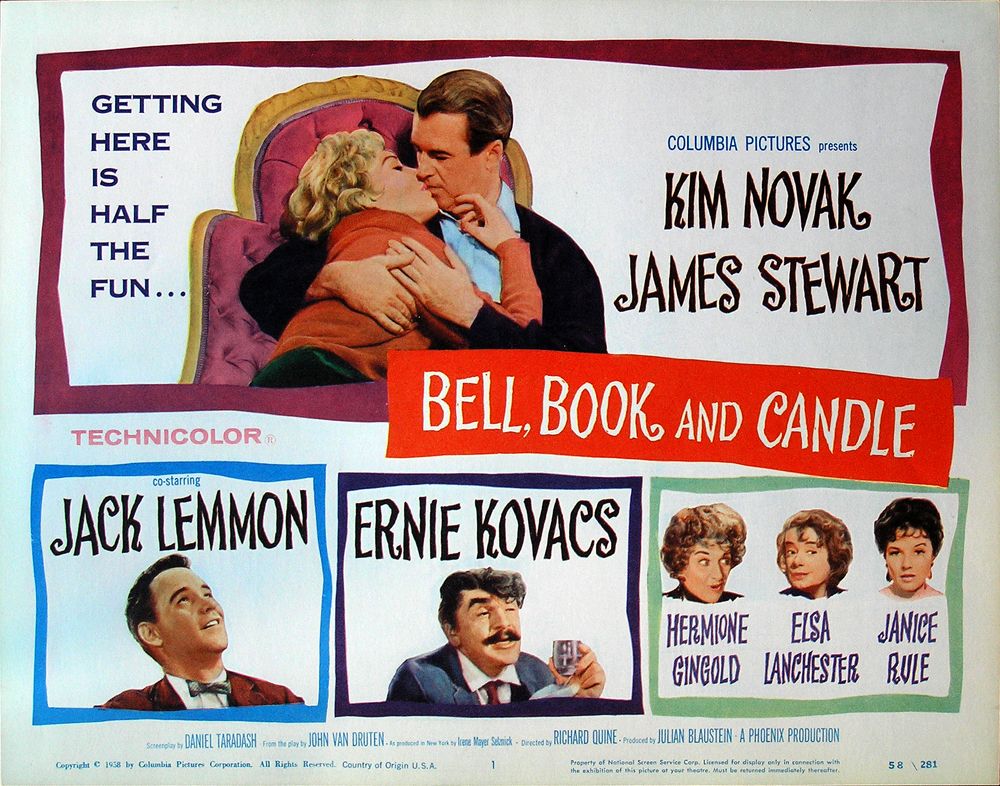 Delightful spoof on witchcraft, based on John Van Druten’s 1950 Broadway play. Kim Novak falls in love with publisher (James Stewart) as her Warlock brother (Jack Lemmon) complicates matters by co-authoring a book on magic with drunken Ernie Kovacs.