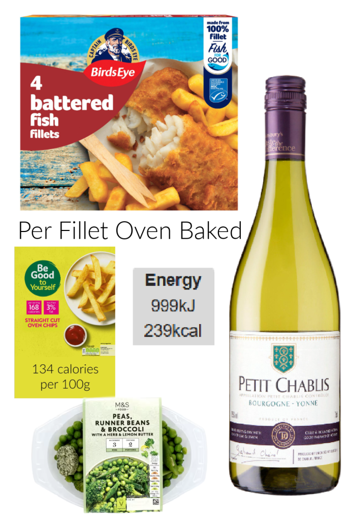 Discovered low calorie battered fish to have with chips peas and Chablis.