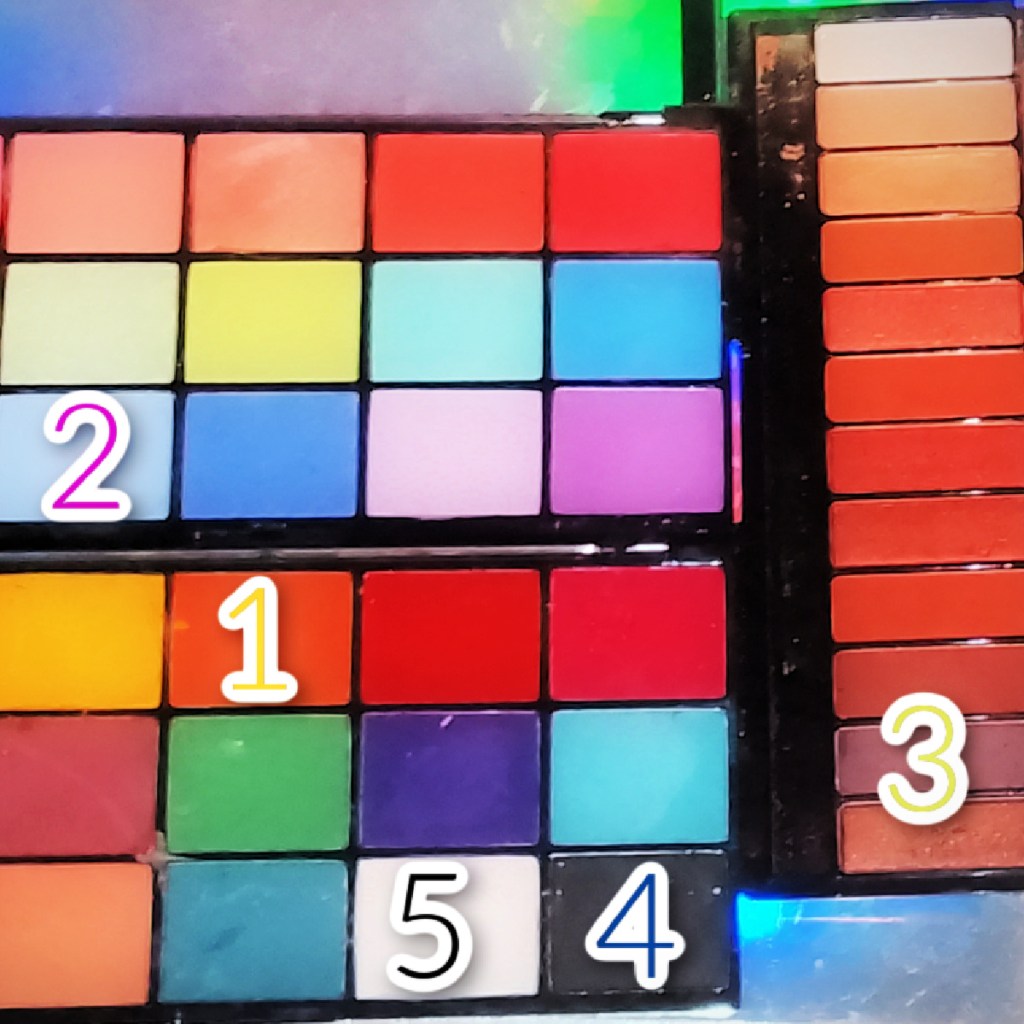 The green colours are the background, got a few face colours right. One and 2 are foundation and powder.
